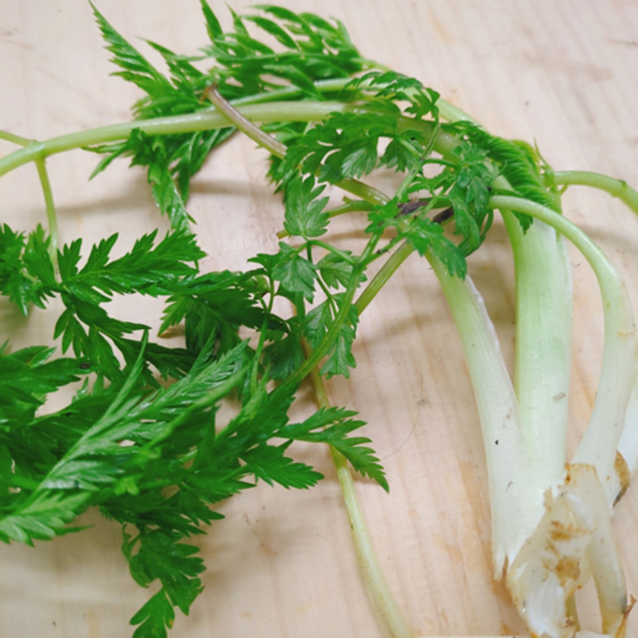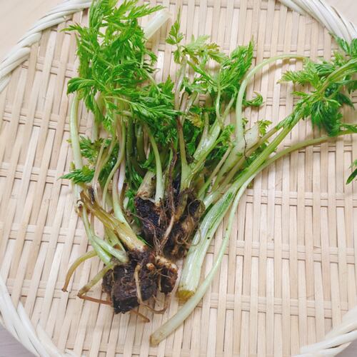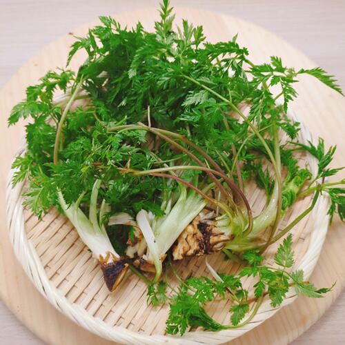 渓谷の水際に生え、若芽はセリとミツバを合わせたような香りと独特な風味で清涼感があり美味しい山菜です。